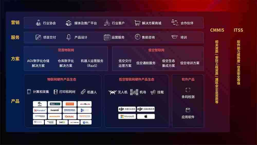 聚合国内外先进的物联网硬件产品品牌,,聚焦数字化仓储、、、机器人运营、、、、低空智联网等领域,,,,共同打造适合客户业务场景的解决方案并提供交付服务